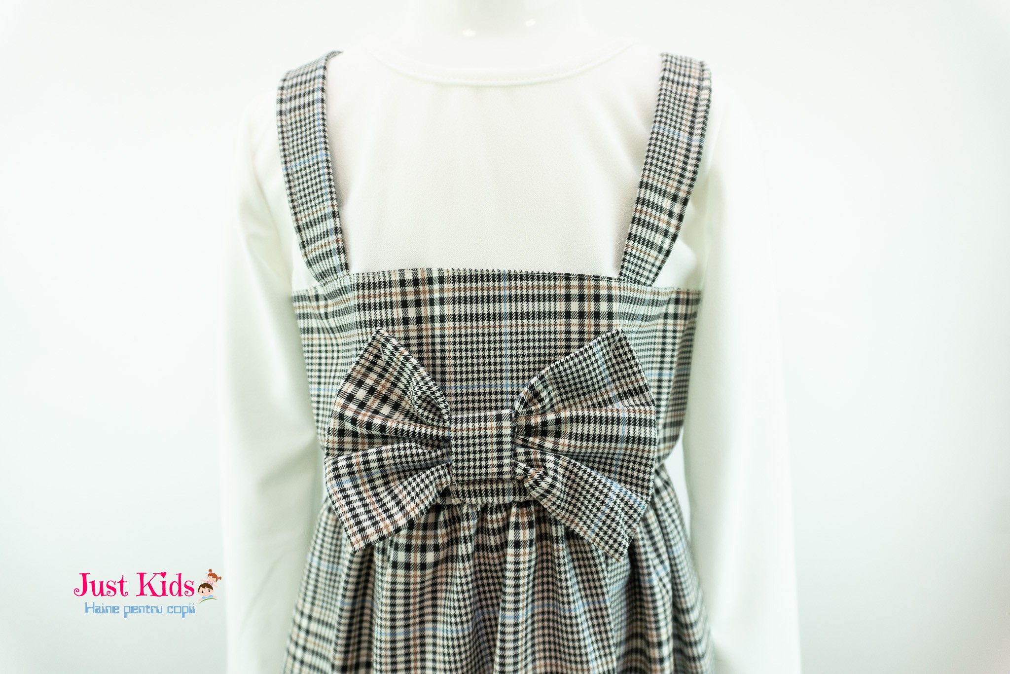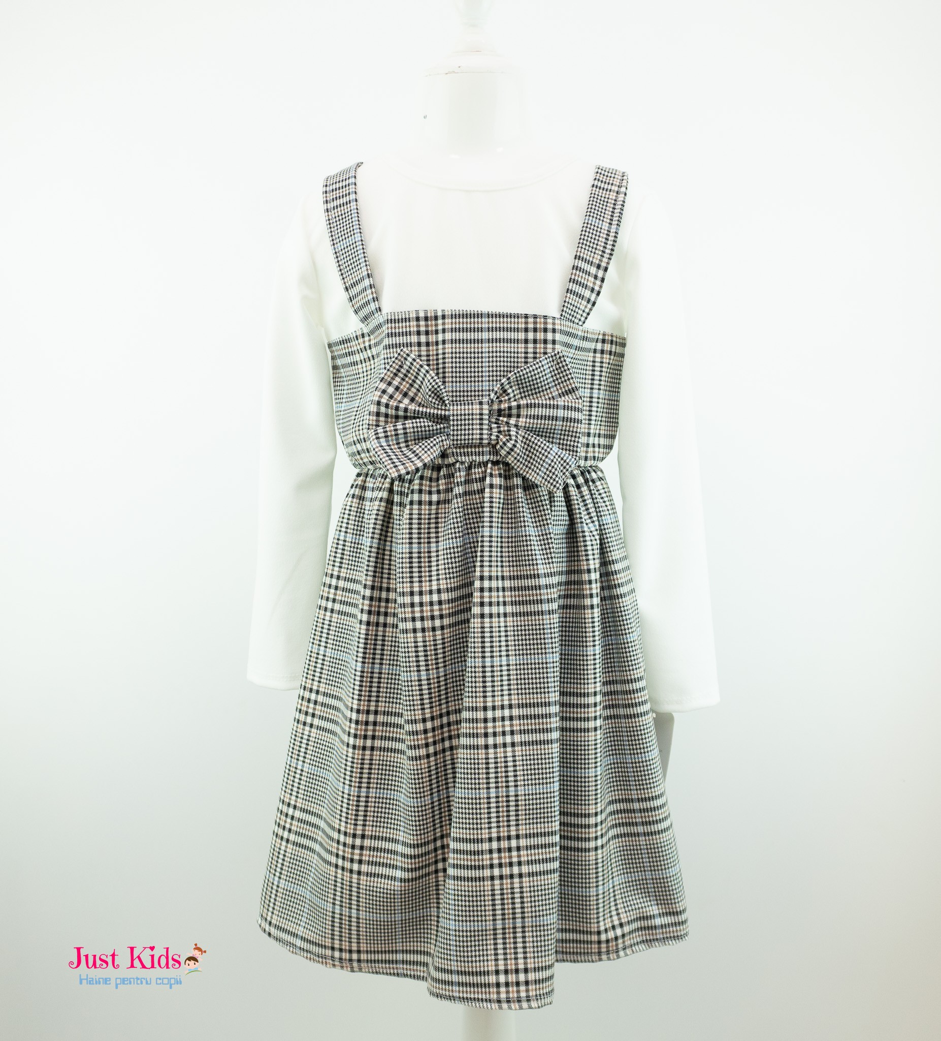 Această rochie cu carouri pentru fetițe este o alegere elegantă și versatilă, fiind potrivită pentru orice ocazie. Rochia vine cu o bluză albă integrată, oferind confort și un aspect chic fără a fi nevoie de straturi suplimentare. Modelul este confecționat dintr-un material de calitate, cu un imprimeu clasic în carouri alb-negru, iar bretelele late și funda mare frontală adaugă un detaliu adorabil și modern. Croiala lejeră și materialul moale asigură confort pe tot parcursul zilei, făcând această rochie ideală pentru școală, evenimente sau ieșiri casual. Disponibilă pentru fetițele cu vârste între 4 și 14 ani, această piesă aduce un aer sofisticat și drăgălaș în garderoba oricărei micuțe fashioniste.